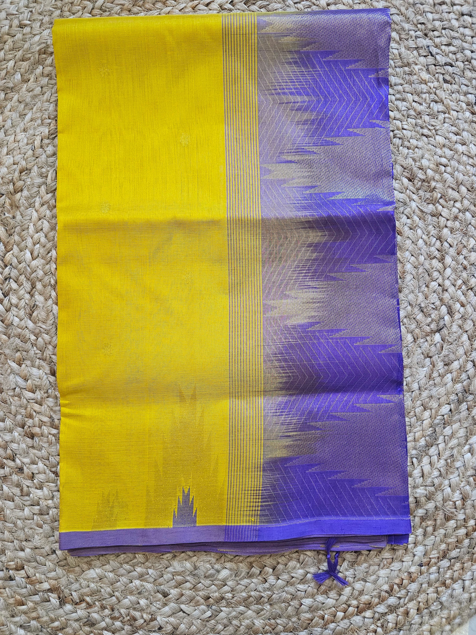 YELLOW WITH ROYAL BLUE TEMPLE DESIGN SILK COTTON SAREE